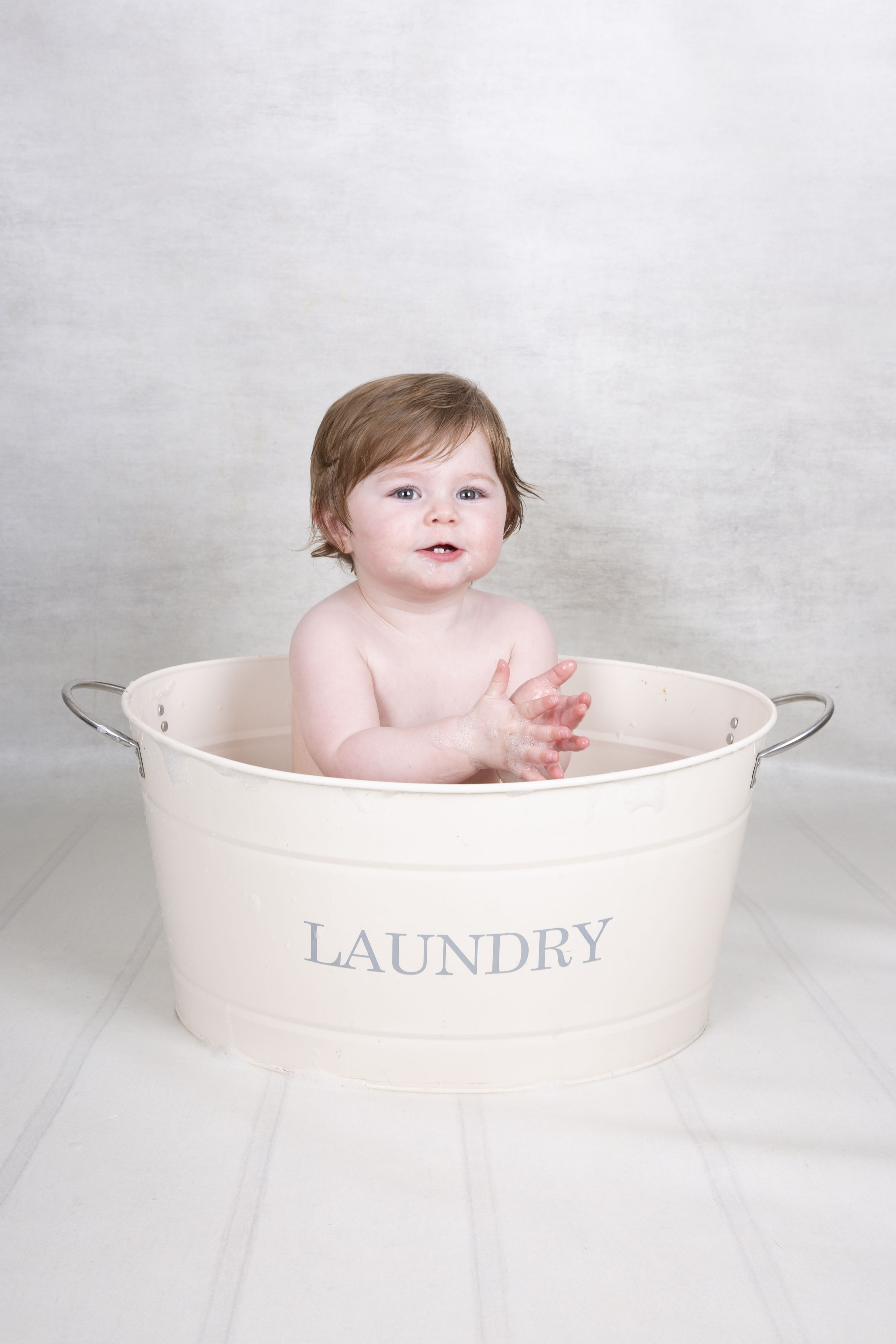 -Warm water and bubbles for photographs and cleaning at the end in a laundry tin, with Johnson’s baby bubble bath