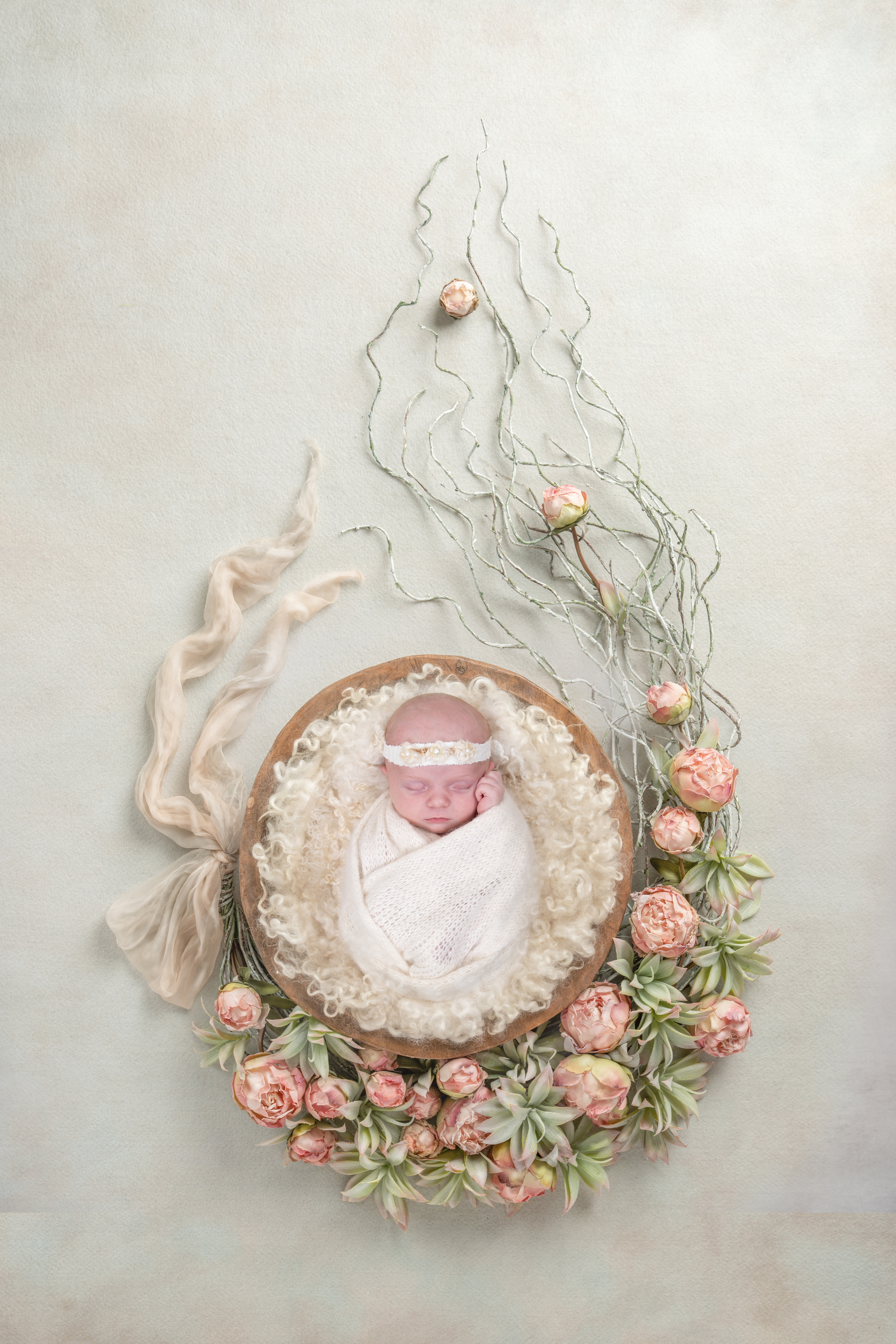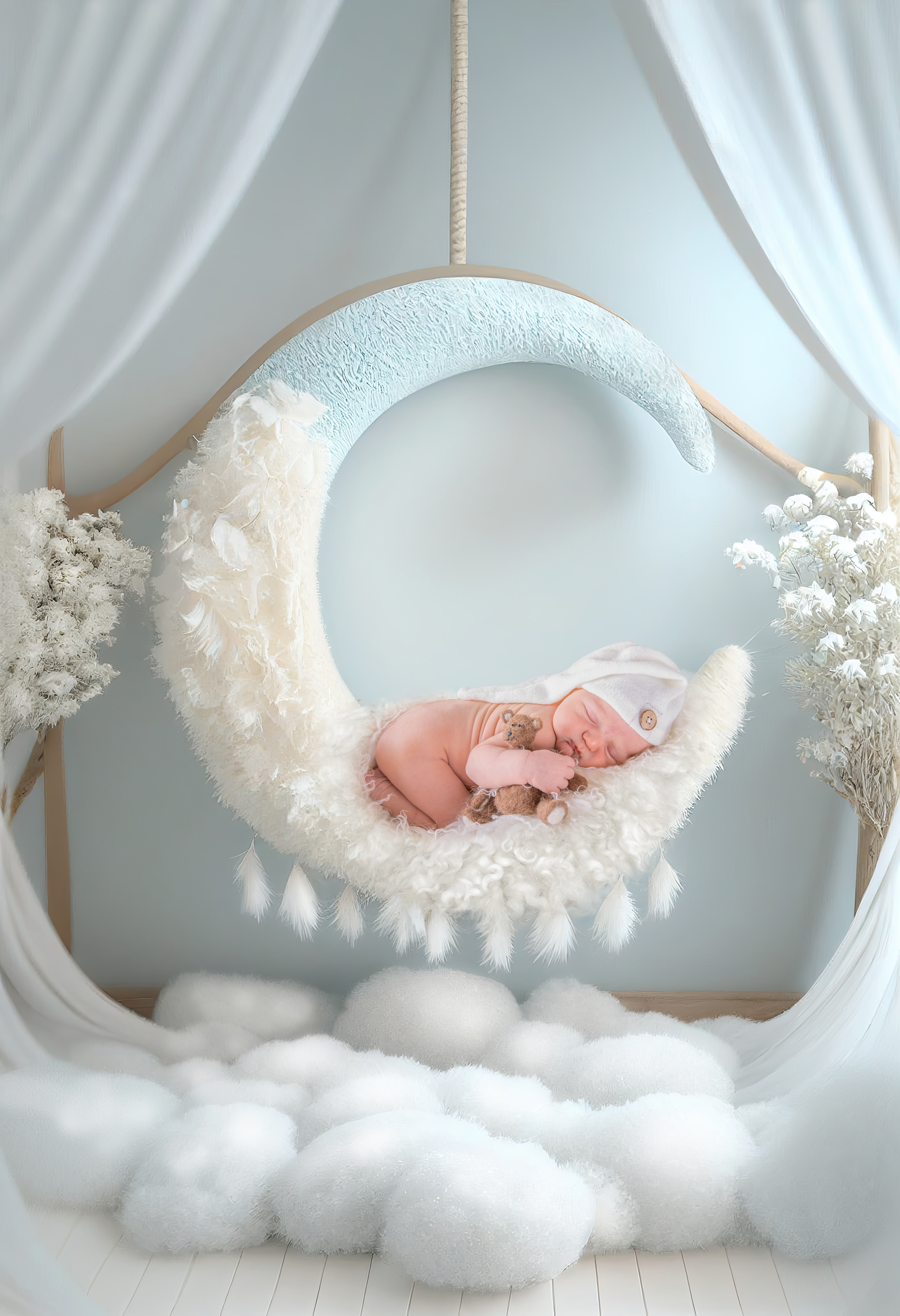 A newborn session is such a precious photo shoot, this is a session that is so close to my heart and the creativity and ideas for these sessions are planned out and put together with such passion and devotion. The props for a newborn shoot consist of bean bag fabrics, bonnets, headbands, hats, outfits, lovies, wraps, stuffers, layers, large artistic props physically and digitally. The list is endless, all my props come from natural fabric suppliers to ensure your newborn is content and warm throughout the session, these products come from renowned suppliers that specialise in creating items for your baby. Depending on the colour scheme and theme of your session new props are purchased before your session to create your dream bespoke artwork.